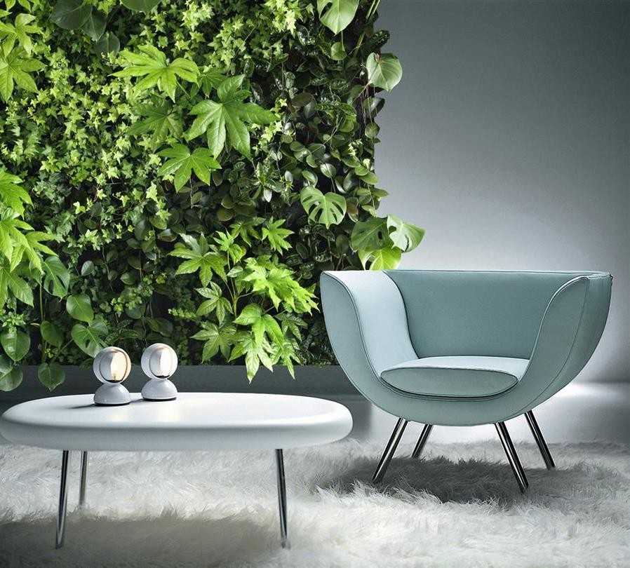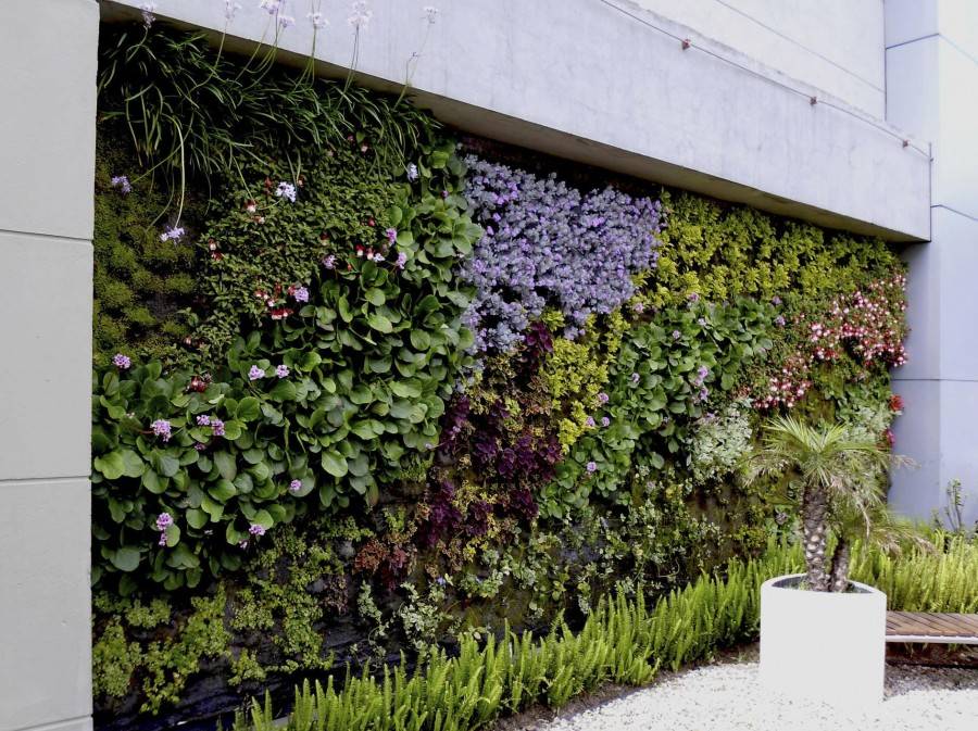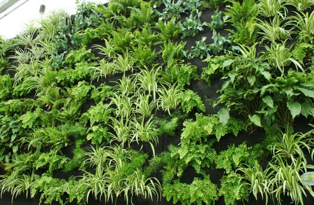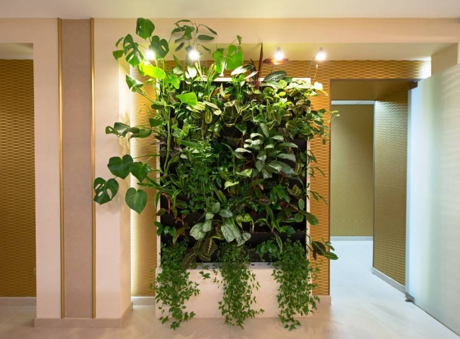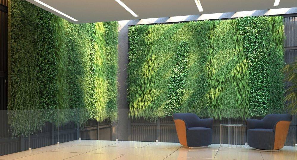 На плоскости стены могут размещаться контейнеры или специальные карманы с грунтом и оросительной системой, заранее спроектированные инженером. Либо войлочное покрытие крепится на стену и карманы из этого же материала наполняются гидрогелем, затем усаживаются растительностью. Такой зеленый ковер будет естественным увлажнителем воздуха, улучшит микроклимат и наполнит помещение кислородом.