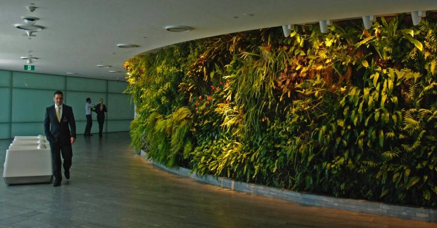 Модернизированные установки обладают системой очищения. Она включает в себя равномерное опрыскивание зелени в определенный промежуток времени. На фото вертикального озеленения представлены лучшие дизайнерские проекты.