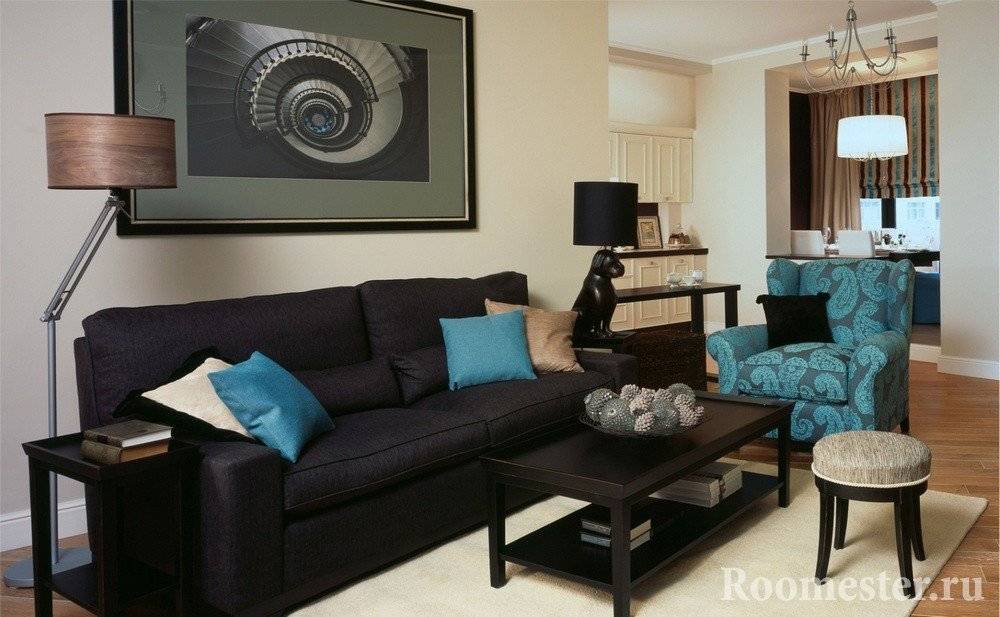 При обустройстве таких помещений используют элегантные модульные кухонные гарнитуры и при этом незамысловатые мебельные изделия. Один из предметов мебели нужно сделать акцентным, от него и будет отталкиваться остальное оформление.