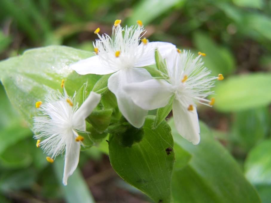 Традесканция белоцветковая (лат. Tradescantia albiflora). Иногда ее называют трехцветной. Ареал произрастания — тропики Южной Америки. Обладает стелящимися стеблями. Листовые пластины имеют форму широкого продолговатого эллипса с параметрами до 6 см в длину и 2,5 в ширину. На верхушке листка есть заострение, сами же листья голые и блестящие, имеют зеленый или серебристый окрас с пестрыми элементами. Соцветия могут вырастать на побегах сверху или в пазухах. Окрас цветков белый и их форма очень мелкая. Этот вид насчитывает несколько сортов.