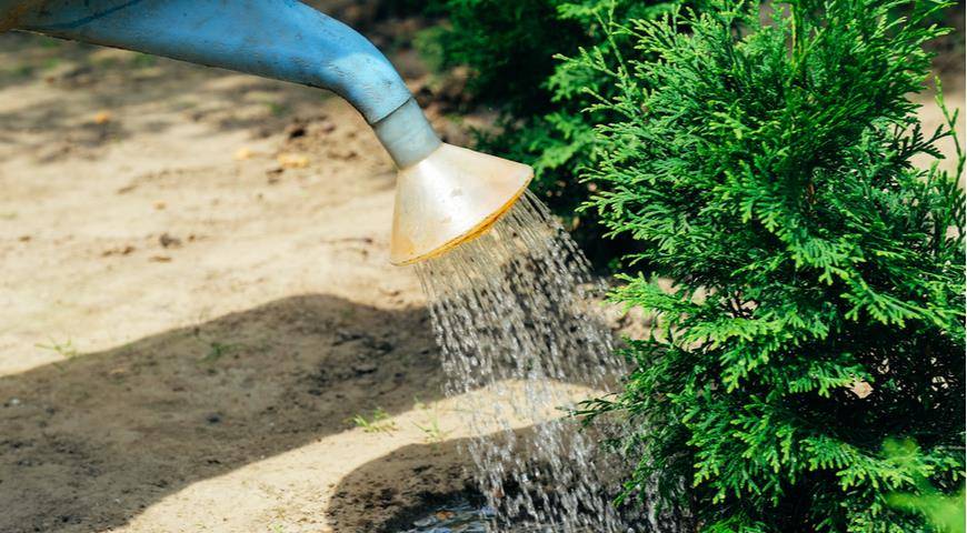 Ухаживать за вечнозелеными растениями несложно. Окрепшие деревца и кустарники не нуждаются в различных стимуляторах роста. Поэтому некоторые садоводы заботу о туе сводят к своевременному поливу и дождеванию. Подкормка больше нужна молодым растениям, которые интенсивно наращивают зеленую массу.