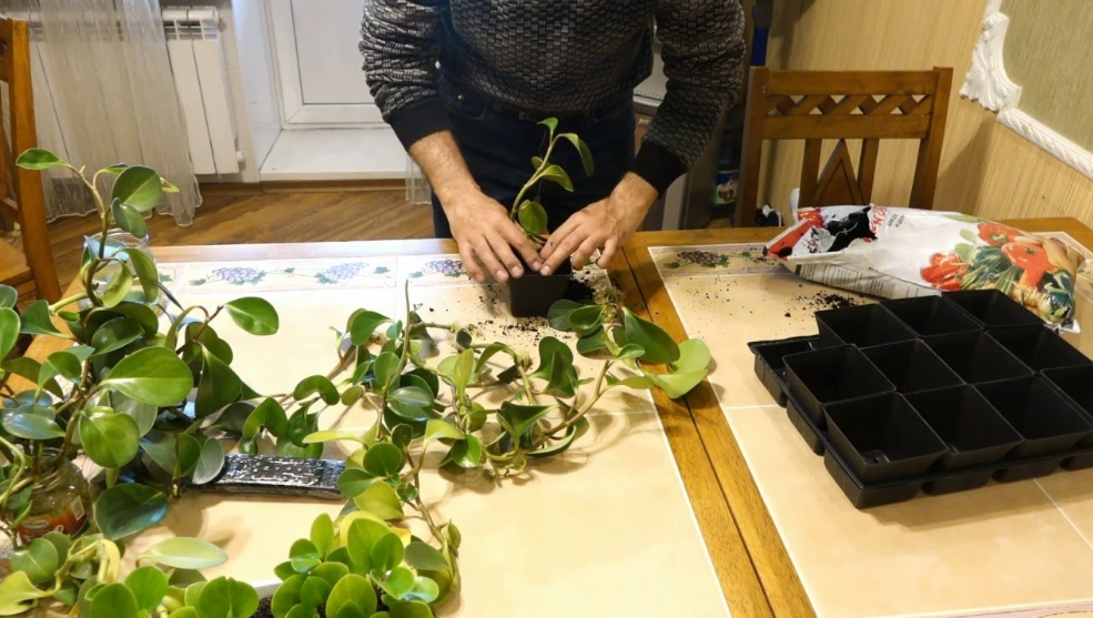 Стебель или верхушка растения с 1-3 узлами необходимо поместить во влажную почву из земли, песка и торфа, и установить в теплое место до укоренения. Формирование корневой системы может отнять 3-4 недели, после чего переромию необходимо рассадить в отдельные емкости.