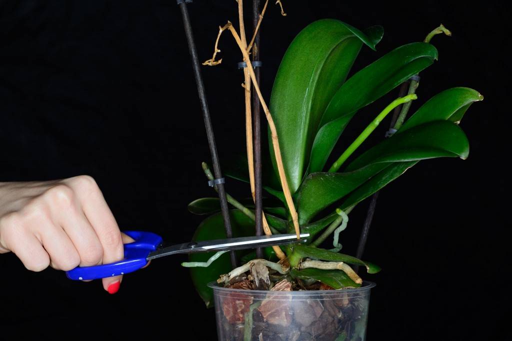 Удалить стебель орхидеи. Срез выполняют максимально близко к основанию растения. Оставшийся пенек не должен превышать 2 см