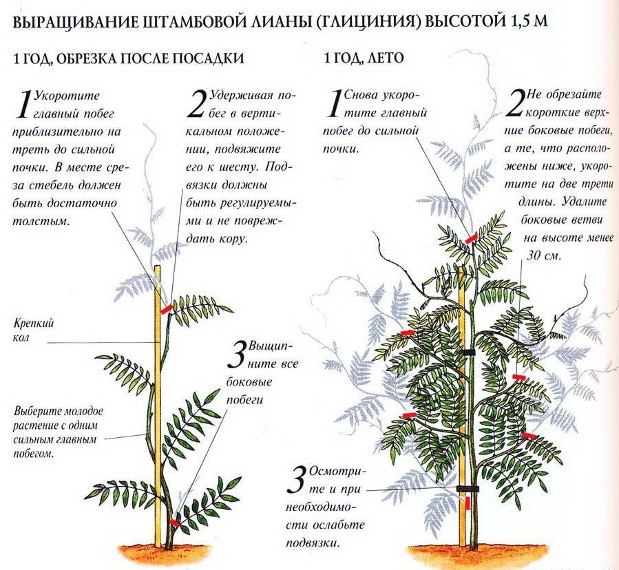 Формирование и обрезка глицинии необходима первые три года, когда формируется основной скелет растения. У штамбовых видов оставляют центральный ствол, боковые побеги обрезают, придавая крону дереву. У плетущейся лианы боковые побеги укорачивают ветви на 4-5 почек, это стимулирует развитие соцветий. Санитарную обрезку глицинии проводят 2 раза за сезон: ранней весной и осенью.