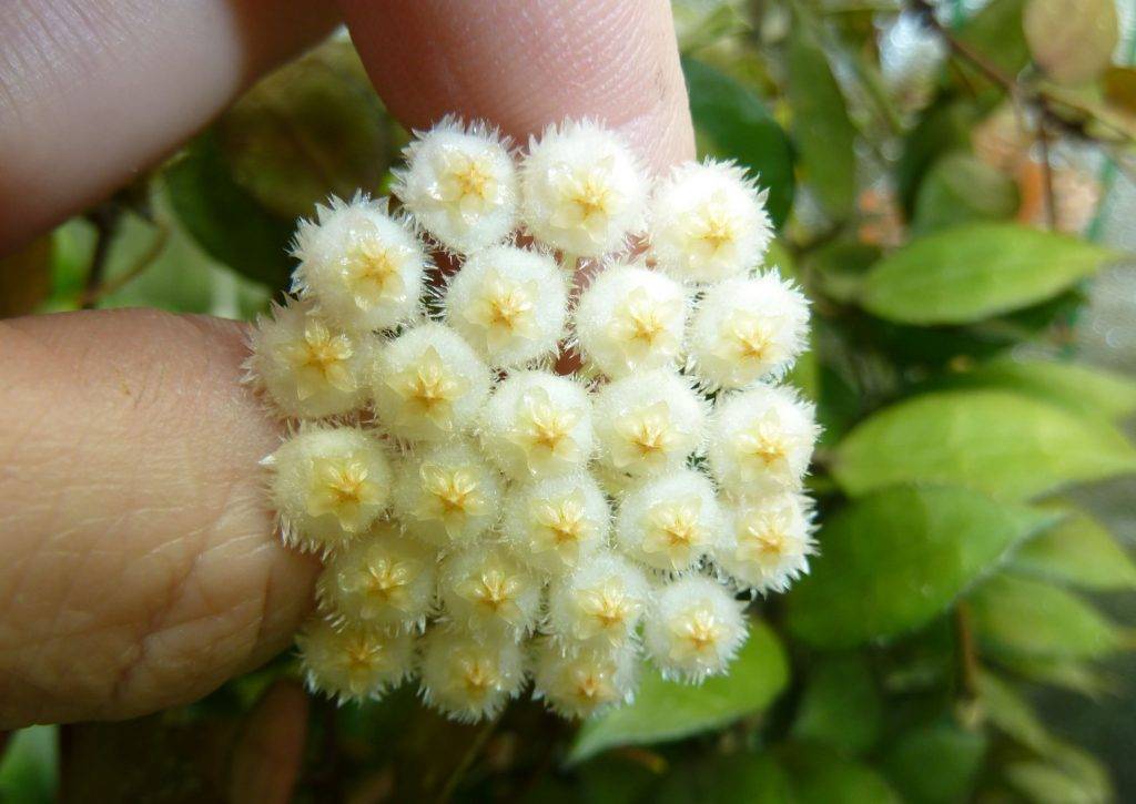 Наиболее популярна у цветоводов хойя карноза, или мясистая. Эта разновидность самая неприхотливая в своем роде! Ее листья, сравнительно крупные, могут иметь бежевую каемку, желтую середину, или быть усеяны белыми точками. Карноза образует крупные соцветия в 20 цветков. Цветение этой разновидности способно длиться с весны до самой осени, практически не прерываясь. Запах соцветий усиливается в вечернее время и напоминает медовый.