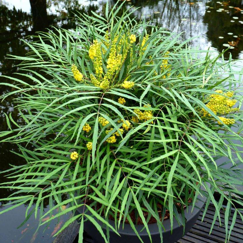 Магония прицветниковая. Декоративный вид, имеющий листики узкой утонченной формы. Один из лучших вариантов для выращивания в горшочках. Участник в межнациональных конкурсах, обладатель наград.