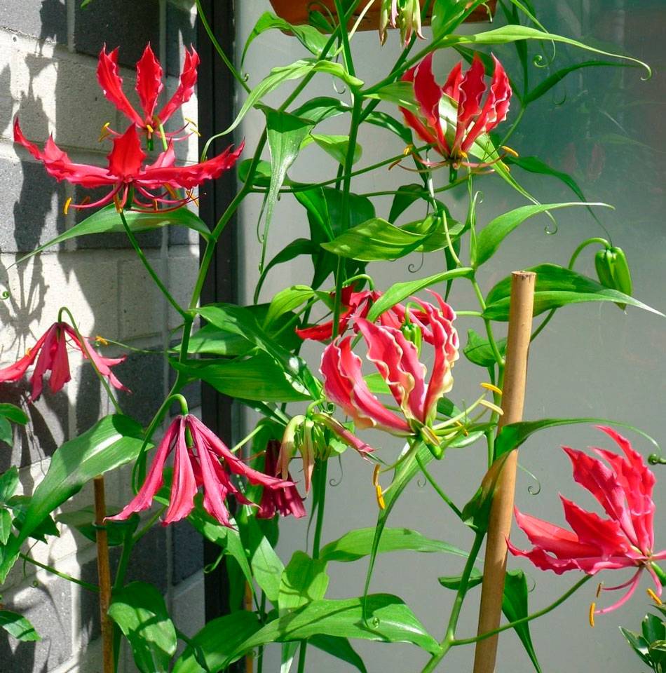 Когда на рассаде появятся небольшие листья, растения можно пересаживать в отдельные горшочки и налаживать систему полива. В условиях правильного ухода глориоза быстро растет, но дома ее высота редко превышает 50—60 см. Вырастить крупные растения можно, если выносить их на улицу в летний период. На третий год можно будет наблюдать, как появляются первые яркие цветы.
