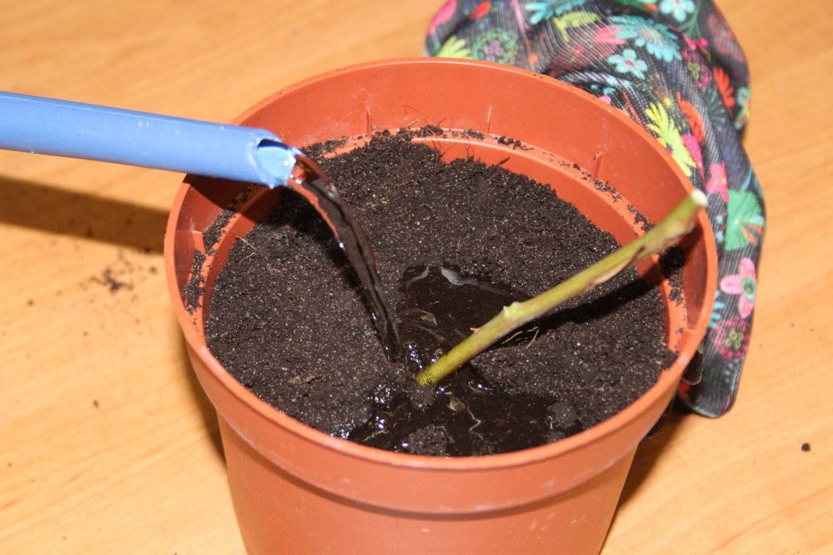 Пока происходит укоренение, вы должны стабильно увлажнять грунт. Более всего для полива подходит вода с сахаром – две чайные ложки на один стакан.