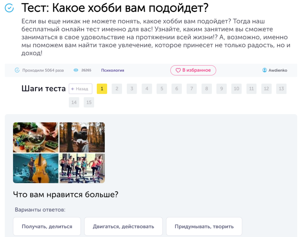 - Пройти тест: просто забейте в строку поиска «как выбрать хобби тест», и пройдите несколько тестов из предложенного списка.