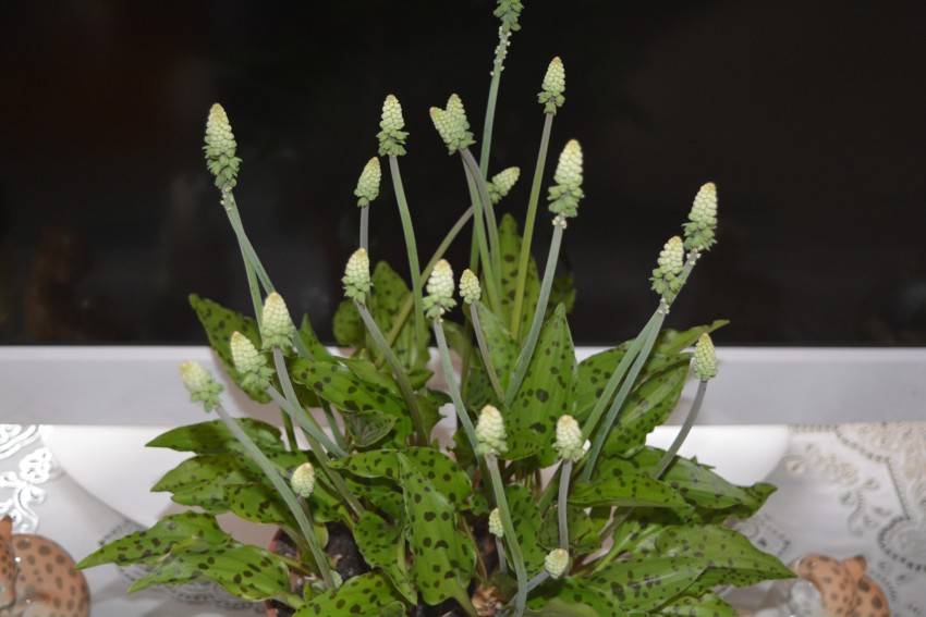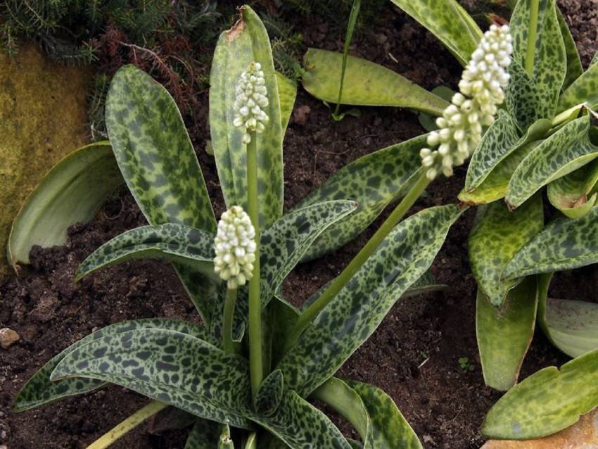 Это луковичное растение является многолетником. На поверхности бледно-зеленой листовой пластины хаотично разбросаны пятна темно-зеленого окраса. Колосовидные либо кистевидные соцветия несут от 10 до 30 штук белых маленьких цветочков.