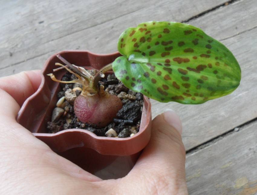 Корневая система у дримиопсиса поверхностная. Поэтому горшок для его посадки подойдет неглубокий, но широкий. В нем растение должно свободно наращивать луковички-детки. Вазон должен быть с хорошим дренажем, с отверстиями на дне.