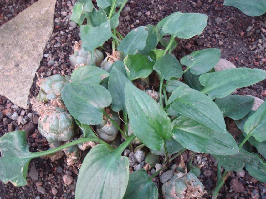 - Пересадка и подбор субстрата. При выращивании дримиопсиса, молодым экземплярам требуется менять горшок и почву в нем ежегодно, взрослым же проводят пересадку только раз на 2–3 года, по мере того, как сильно разрастаются луковички-детки. Новую емкость рекомендуется брать более широкую, нежели глубокую, чтобы было место для будущих луковичных образований. На дно кладется дренажный материал приблизительно 2–3 см (ним может выступать керамзит, галька или керамические черепки).