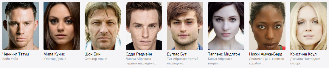 В фильме роли претендентки на межгалактический трон Юпитер сыграла Мила Кунис. Девушка до переезда в США жила в украинском городе Черновцы, что роднит ее с главной героиней фильма Юпитер, родители которой по сюжету встретились в Петербурге. В главной мужской роли – военного охотника Кейна Уайза, снялся Ченнинг Татум.