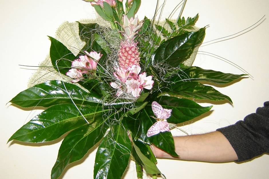 Листья аспидистры, драцены и аукубы добавляют в букеты для придания пышности и создания зеленого фона для цветков. Их стебли перед помещением в вазу расщепляют на две части.