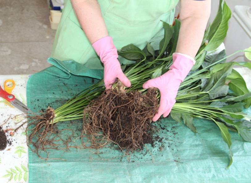 У спатифиллума стебель отсутствует как таковой, а листья вырастают непосредственно из корневища и формируют некое подобие кустика. Их высота составляет от 12 см до 1.1 метра. Поэтому черенки у цветка формируют из листовых розеток, отделённых от взрослого растения. Обычно, у них уже есть корешки, поэтому они могут быть сразу после приготовления высажены на новое место.