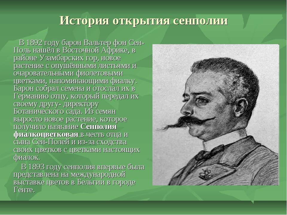 Многих интересует вопрос, когда и где появилась фиалка. Родина растения – Узамбарские и Улугурские горы Восточной Африки. Фиалку именуют «узамбарской» в честь гор, где она впервые была обнаружена. Другое название – «сенполия» – фиалка получила в честь своего первооткрывателя – барона Вальтера фон Сен-Поля, который будучи губернатором этой страны, был покорен красотой незнакомых цветов. Восхищенный бледно-голубым сиянием, исходившим от растения, барон отослал фиалки своему отцу, который на тот момент был известным цветоводом и коллекционером орхидей. Последний же показал их директору ботанического сада в Ганновере.