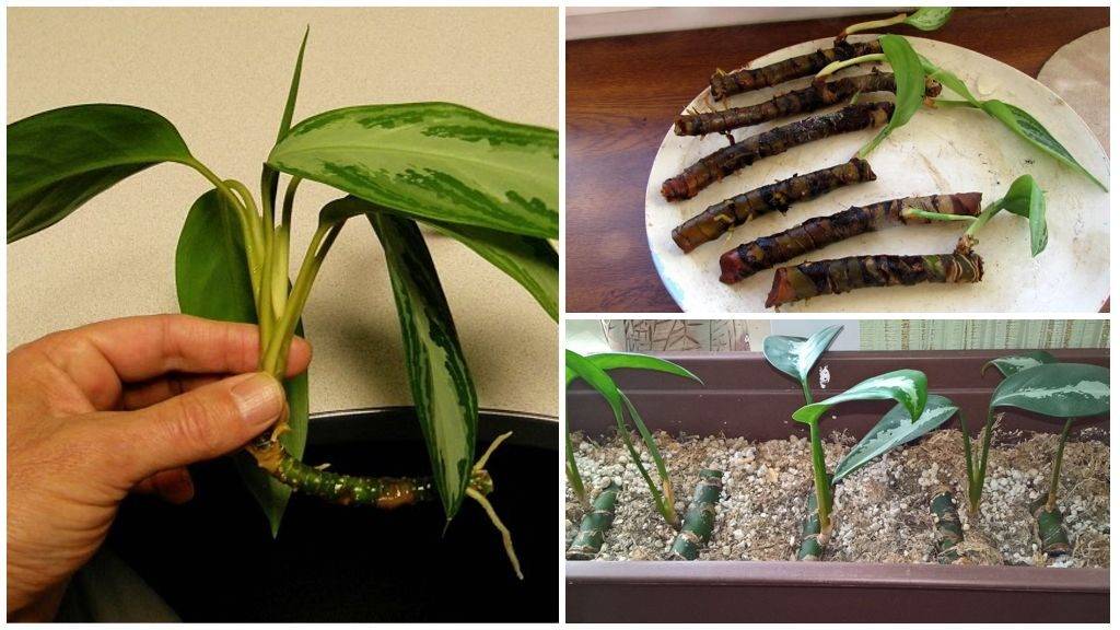 Аглаонема успешно размножается и черенками. Для этого годится нижняя часть сильного и здорового стебля, который срезается практически на уровне почвы. Корни на черенках появляются из спящих почек. Техника черенкования включает в себя следующие манипуляции: