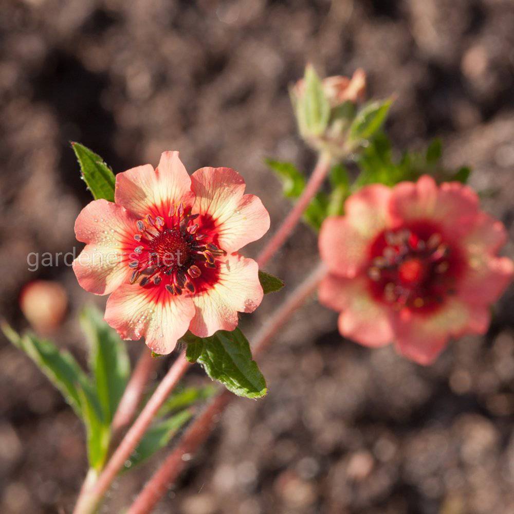 - “Флорес” — сортовая разновидность непальской лапчатки, цветки которой имеют в качестве основного лососевый оттенок, но, как и у других представительниц братства, у них есть глазок внутри цветка, и он окрашен в апельсиновый колор.