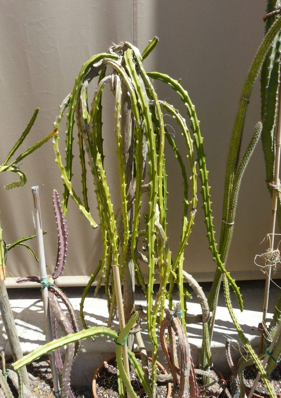 На всей поверхности граненых стеблей с сизо-зеленым оттенком расположены колючки, напоминающие шпоры.