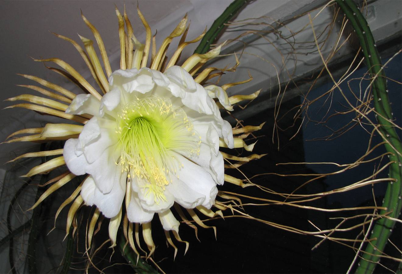 Невероятно красивый цветок расцветает по ночам, оттого и называют его порой «лунный кактус»
