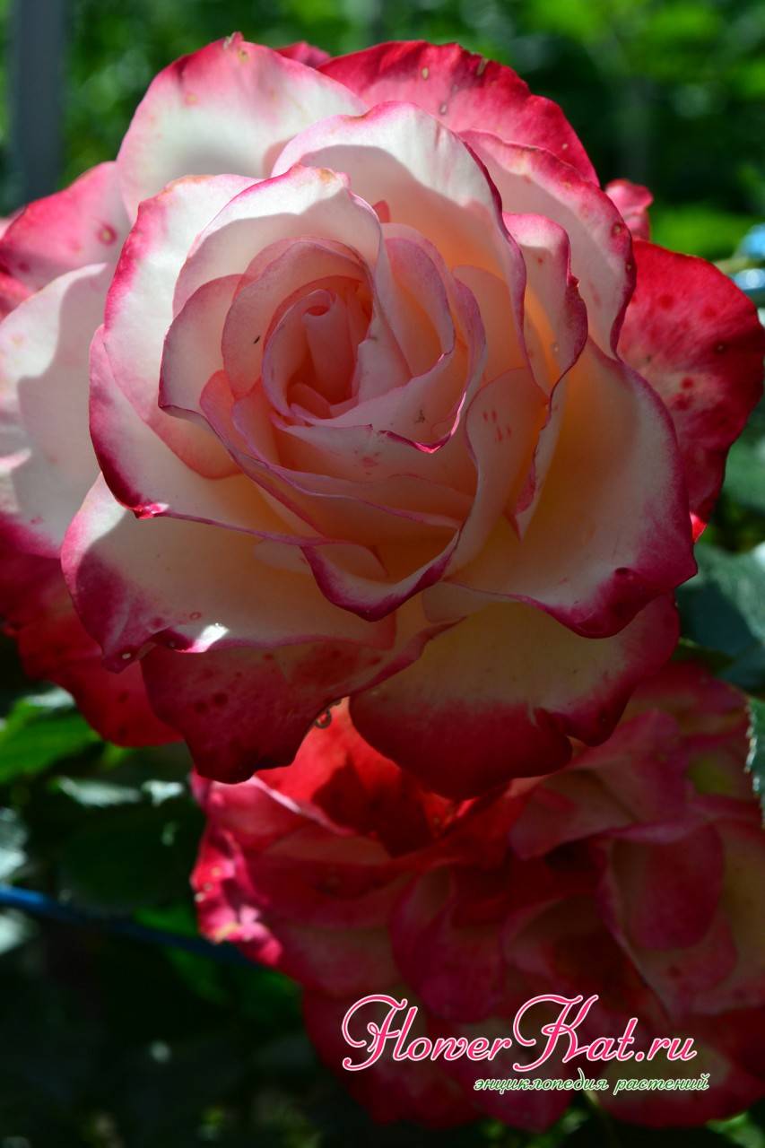 Цветы с градиентной окраской выглядят очень оригинально. Бутоны — кремово-белые или оттенка слоновой кости с очень тонкой красной каймой. Пока они раскрываются, кайма постепенно расширяется и меняет цвет на пунцовый, малиновый, алый, вишнёвый. Весь процесс занимает около двух недель. В итоге каждый цветок имеет уникальную окраску. На стебле их 3–5 штук. Диаметр розы — 8–10 см. В каждом цветке по 30–40 лепестков.