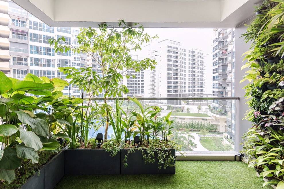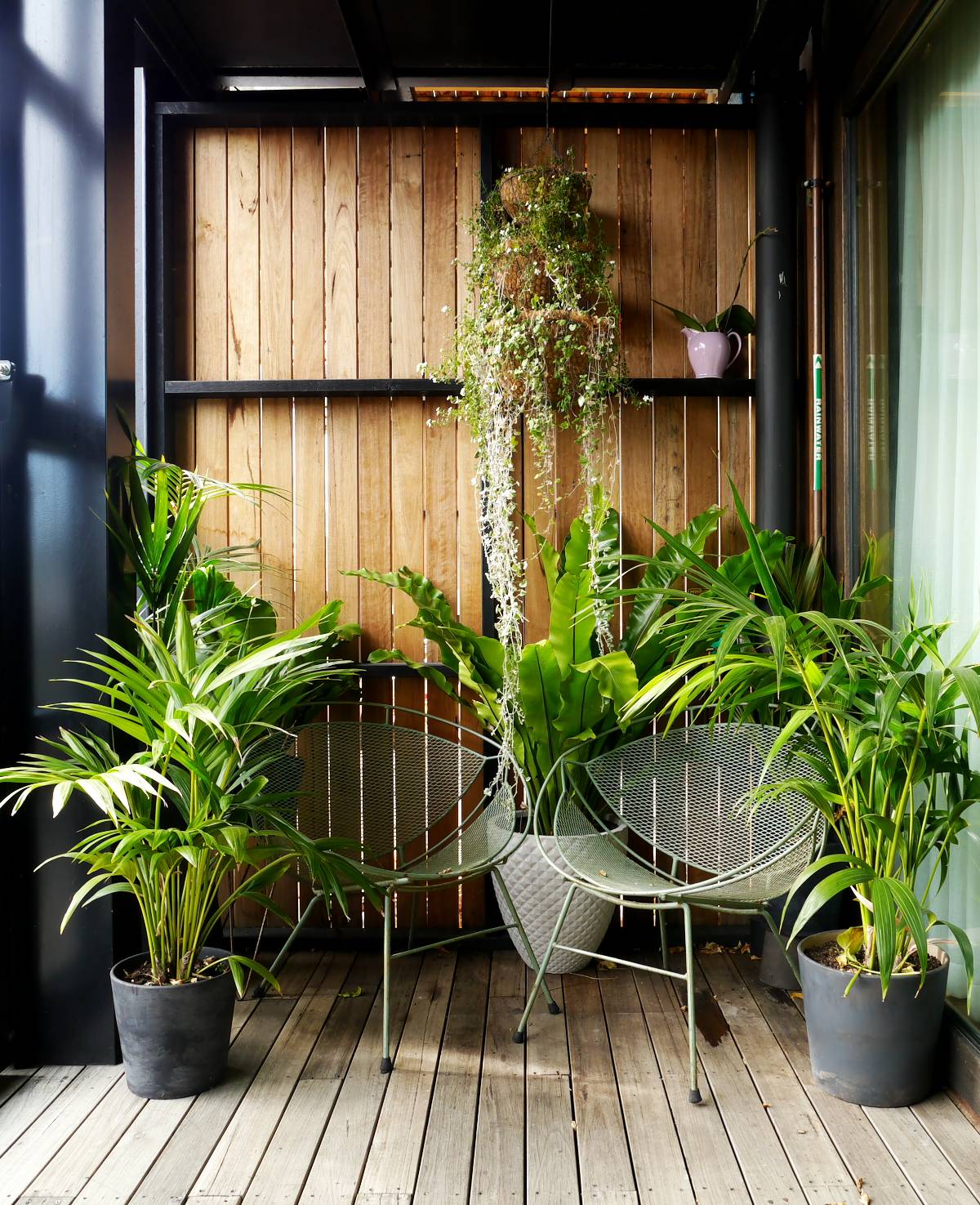Вертикальное озеленение будет оптимальным вариантом для узкого помещения: вы сможете украсить балкон большим количеством растений, оставив при этом достаточно места для установки пары стульев.