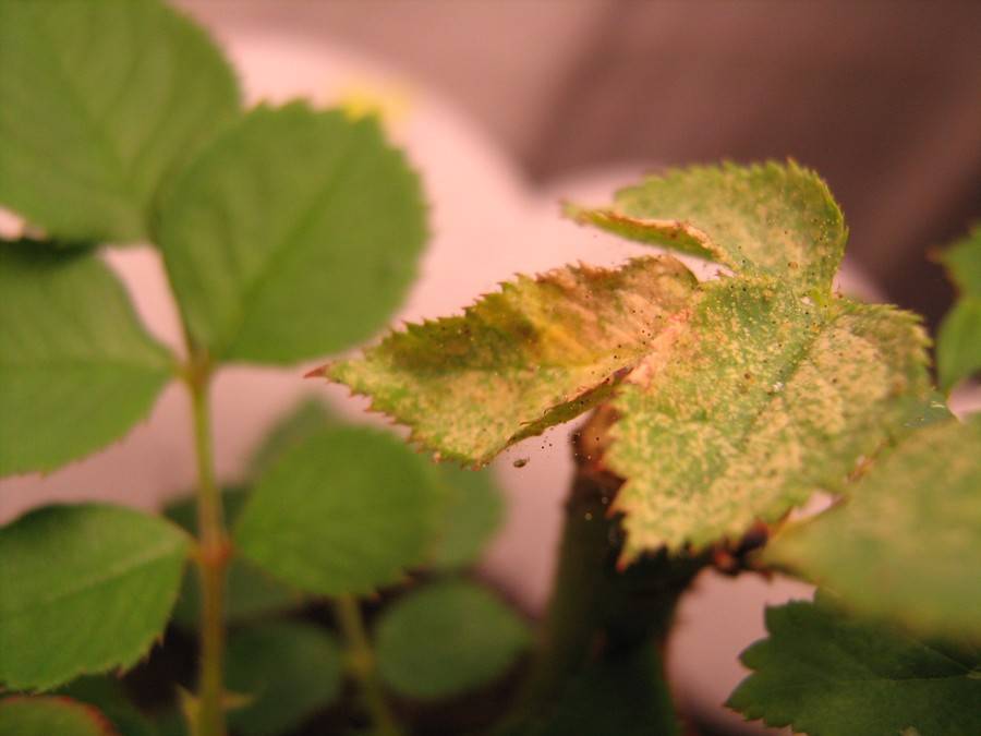 Это насекомое приводит к пожелтению вегетативной части, усыханию ее, отмиранию молодых побегов. Заводится вредитель в условиях сухого воздуха, а также при излишней скученности растений. Сигнализировать о наличии паутинного клеща могут светлые пятнышки на зелени розы, небольшие, едва заметные паутинки в укромных уголках цветка.