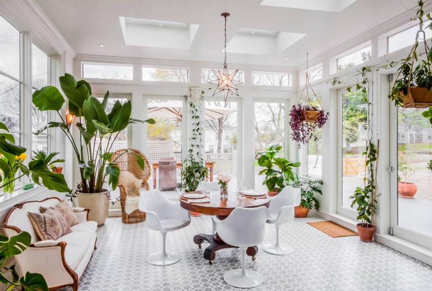 Буферным зимним садом называют нежилое помещение, находящееся между домом и улицей. Вход в него обычно осуществляется и со двора, и из дома. Здесь не только можно проводить время за отдыхом и созерцанием растений, но и использовать пространство в качестве входной зоны – террасы или прихожей. Поскольку помещение неотапливаемое, здесь можно выращивать только определенные виды неприхотливых растений. По ночам температура может резко опускаться, а перепады температур переносят не все растения. На зимнее время цветы обычно забирают в дом, оставляя зимовать только приспособленные к периоду покоя. Буферные постройки легко и быстро возводятся, их несложно содержать. За счет большой площади остекления такой зимний сад будет освещен естественным светом с улицы большую часть дня.