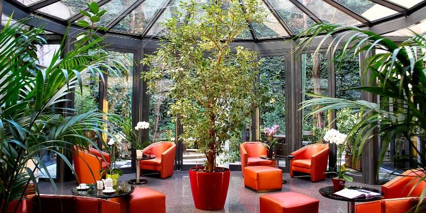 Французский зимний сад утопает в роскоши. Зеркала помещаются в золоченые рамы, на мебели дорогая обивка, кругом скульптуры, лепнина и фарфоровые вазы. Это уютное и утонченное место для отдыха.